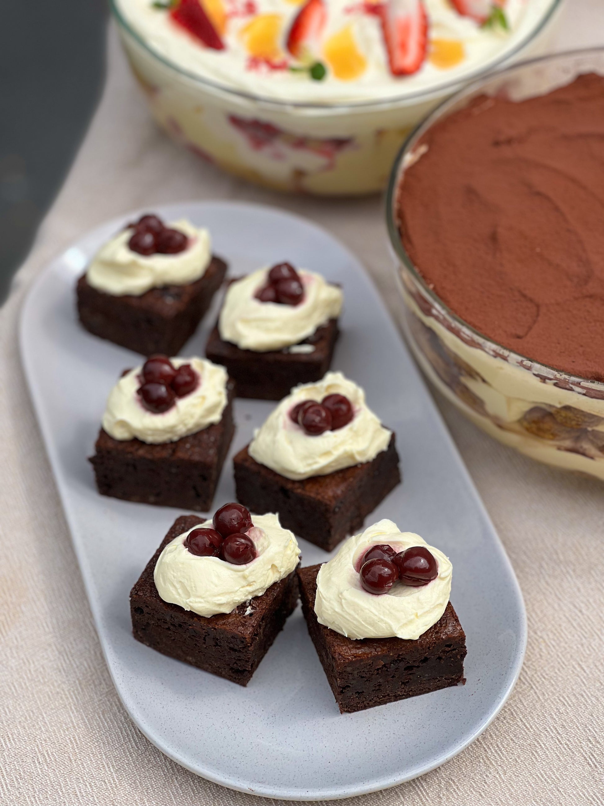Rich and fudgy gluten free chocolate brownie, served with vanilla mascarpone cream and macerated cherries for a festive finish.